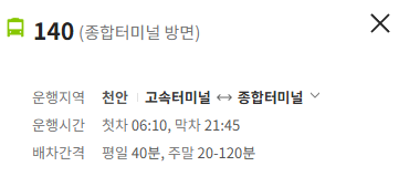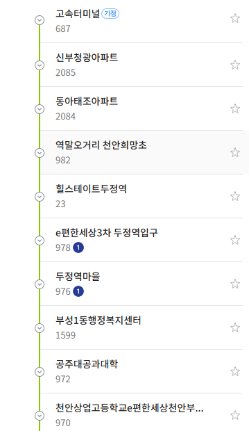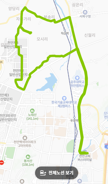 천안 종합터미널 접근성: 노선의 시작점 및 종점 부근이 천안의 핵심 교통 중심지인 **고속터미널(종합터미널)**과 연결되어 있습니다. 이는 천안 시외/고속버스 이용객들이 시내 다른 지역으로 이동하기 매우 편리하게 합니다.