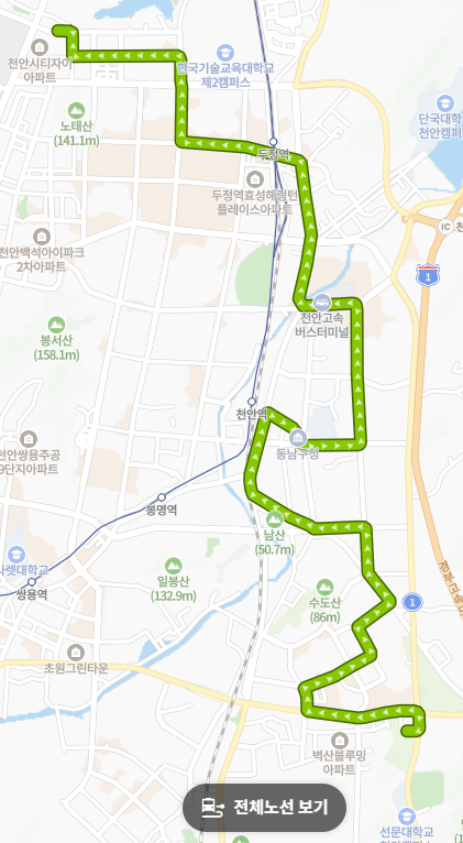 천안의 남쪽 신도시인 청당·청수지구와 북쪽의 신흥 주거지인 성성지구를 한 번에 이어줍니다. 양쪽 신도시 주민들이 천안역이나 터미널 같은 중심부로 이동할 때 매우 유용하며, 신도시 간의 교류를 돕는 중요한 역할을 합니다.