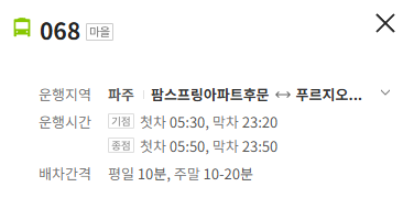 파주 068번 버스 운행노선 팜스프링아파트후문→송화초교→팜스프링아파트정문→팜스프링아파트→금촌농협→금촌역→금촌사거리→장안아파트→파주시청→교육지원청→흰돌아파트→파주스타디움→대창리→말레이지아교→조리읍행정복지센터→봉일천시장→미림아파트앞→봉일천중학교→푸르지오정문→봉일천2리.공원앞→푸르지오후문→푸르지오정문→봉일천중학교→미림아파트앞→봉일천시장→조리읍행정복지센터→말레이지아교→대창리→파주스타디움→흰돌아파트→교육지원청→파주시청→장안아파트→금촌사거리→금촌통일시장→금촌역→금촌1동→팜스프링아파트→팜스프링아파트정문→송화초교→팜스프링아파트후문