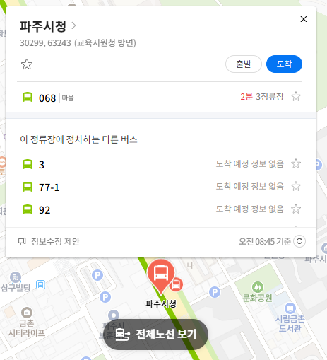 행정 중심지 경유: 파주시청, 파주교육지원청 등 주요 행정기관 앞을 지나가기 때문에 민원 업무나 행정 관련 방문 시 유용합니다.