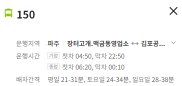 파주 150번 버스 운행노선 장터고개.맥금동영업소→배무기→검산초등학교→유승아파트→성원아파트→대방아파트→풀무골→문산제일고→문산제일고삼거리→방호벽사거리→독점말.대방노블랜드2차아파트→금촌동문아파트→팜스프링아파트→금촌농협→금촌역→금촌전통시장입구→순달교→금촌교→하지석동입구→교하파출소→이마트파주점→당하동삼거리→당하동→와동동→가람마을4단지→가람마을3.4.6단지→가람마을2.8단지(중)→해솔마을4단지→지산중학교.운정행복센터→해솔마을6.7단지→한빛마을1단지→새암공원→한울마을3.5단지→운정야당지구대→한울공원→동패중.고등학교→삽다리사거리→덕이동문아파트→중앙하이츠아파트→만자고개→백송고등학교.백송마을→고양예고입구→송산3통→덕이초등학교→덕이동행정복지센터사거리→농수산물센터→예비군훈련장.성저3.4단지→대화역→백병원(중)→문촌마을(중)→주엽역(중)→강선마을(중)→일산동부경찰서(중)→일산동구청(중)→마두역(중)→호수마을(중)→알미공원(중)→백석역(중)→흰돌마을.서안아파트→우편집중국→섬말다리→신주택→일산화훼단지→삼성당→삼성당다리→대곡역두산위브→능곡초교→능곡시장→능곡역→능곡전화국→능곡화원→행주IC(경유)→개화IC(경유)→개화역1번출구.개화검문소→개화119안전센터→방화중학교→롯데몰.김포공항역→국제선진입(경유)→김포공항국제선(2번홈)
