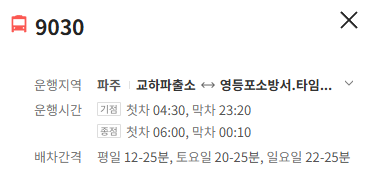 파주 지역에서 서울 도심으로 출퇴근하는 승객이 많기 때문에, 출퇴근 피크 시간대에는 배차 간격이 짧아 비교적 기다리는 시간 없이 버스를 이용할 수 있습니다.