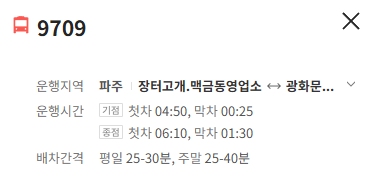 ● 심야 시간 운행: 다른 광역버스 노선들의 막차가 비교적 일찍 끊기는 것에 비해, 9709번은 서울역(숭례문) 기준 새벽 2시까지 운행하여 심야 시간대 서울에서 파주로 돌아오는 이용객들에게 유용합니다. (기점 막차 00:25, 종점 막차 01:30~02:00)
