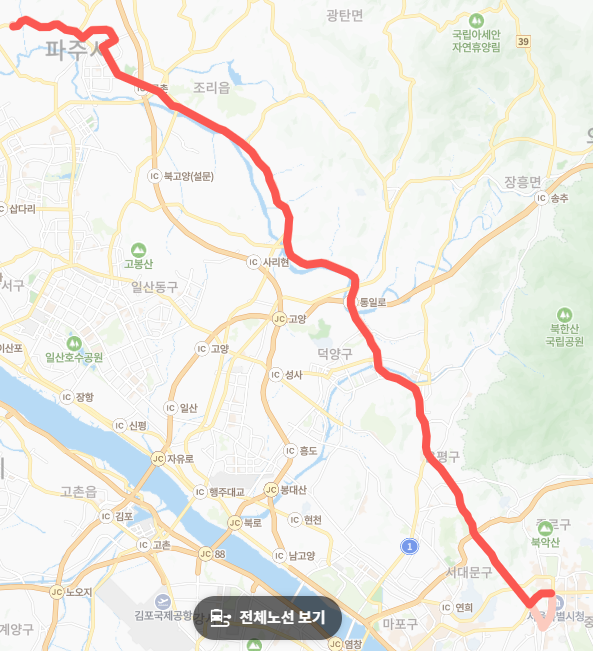 ● 서울 도심 접근성: 파주에서 광화문, 시청, 서울역 등 서울의 핵심 도심 지역으로 직접 연결되어 출퇴근이나 서울 나들이 시 매우 편리합니다. 특히 통일로를 통해 서울로 진입합니다.