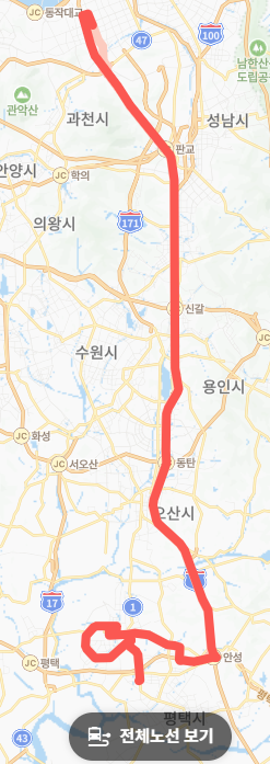 평택 5401번 버스 운행노선 평택지제역 (기점)→ 송탄교차로 (경유, 미정차)→ 송탄공단삼거리 (경유, 미정차)→ 장당고가교 (경유, 미정차)→ 삼성전자(중)→ 리슈빌레이크파크(중)→ 호반써밋에듀파크(중)→ 파라곤에듀포레.제일풍경채2차에듀(중)→ 고덕중앙1로진입로 (경유, 미정차)→ 서정리역(중)→ 고덕파라곤(중)→ 고덕자연앤자이→ 우미이노스빌아파트→ 송탄IC (경유, 미정차)→ (고속도로 진입 - 경부고속도로→ 남사진위IC (경유, 미정차)→ 오산IC (경유, 미정차)→ 동탄JC (경유, 미정차)→ 기흥동탄IC (경유, 미정차)→ 기흥휴게소 (경유, 미정차)→ 수원신갈IC (경유, 미정차)→ 신갈JC (경유, 미정차)→ 죽전 (경유, 미정차)→ 금곡 (경유, 미정차)→ 서울TG (경유, 미정차)→ 판교IC (경유, 미정차)→ 금토JC (경유, 미정차)→ 서울진입 (경유, 미정차)→ 청계산입구역 (경유, 미정차)→ 양재IC (경유, 미정차)→ 서초IC (경유, 미정차)→ KCC사옥→ 신논현역.금강빌딩→ 강남역.지오다노 (경유, 미정차)→ 강남역10번출구 (경유, 미정차)→ 신분당선강남역(중) (종점)