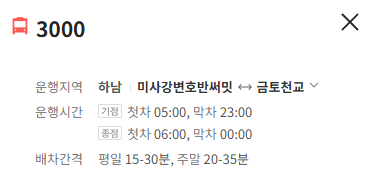 하남 3000번버스 운행노선 미사강변호반써밋→하남종합운동장.국민체육센터→한강유역환경청.미사고등학교.미사가람마을→미사강변한신더휴.트래지안→구산문화마을.구산성당→미사강변중학교.미사강변리버나인→미사강변2차푸르지오.미사강변고등학교→미사강변리버스위트칸타빌.리슈빌→미사강변스타힐스.금빛마을→미사2동행정복지센터.하남시미사보건센터→미사강변푸르지오.하우스디더레이크→하남장애인복지관.미사1동행정복지센터→미사강변브라운스톤→청아초등학교.신안인스빌.브라운스톤→제일풍경채.미사강변신안인스빌→아이테코.이편한세상미사→하남시청소년수련관.청소년상담복지센터→황산사거리.미사3동행정복지센터.미사센텀비즈→하남JC(경유)→서하남IC(경유)→송파IC(경유)→가천대→성남TG(경유)→성남IC출입(경유)→성남시청전면→동부.코오롱아파트→야탑역.종합버스터미널(전면)→쌍용아파트→삼환진덕아파트→탑마을대우아파트→송현초등학교.판교이지더원2단지→판교신미주아파트.봇들3단지→차그룹컨소시엄→봇들육교→금토천교