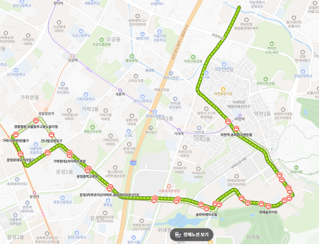 차량출발(미정차)→마천터널교차로(미정차)→마천사거리(미정차)→마천역.송파파크센트럴→위례로제비앙.단독주택단지→위례아너스포레.포레자이→위례숲초등학교.중흥S클래스.우미린→위례숲우미린→위례호반써밋.힐스테이트센트럴위례→포레나송파→포레나송파후문→송파레이크힐아파트→송파레이크파크호반써밋1차후문→문정3차푸르지오아파트.송파파인타운1단지→문정동래미안아파트남문→가락현대1차아파트후문→문정1동주민센터.로데오거리→문정로데오거리입구→가락시장역5번출구→경찰병원.서울동부고용노동지청→건너말공원입구→가락현대1차아파트후문→문정중학교후문→문정3차푸르지오아파트.송파파인타운1단지→송파레이크파크호반써밋1차후문→송파레이크파크호반써밋2차정문→송파위례리슈빌→위례호반써밋→위례호반써밋.힐스테이트센트럴위례→위례숲우미린→위례숲초등학교.우미린.중흥S클래스→위례포레자이.아너스포레→위례로제비앙.단독주택단지→마천역.송파파크센트럴