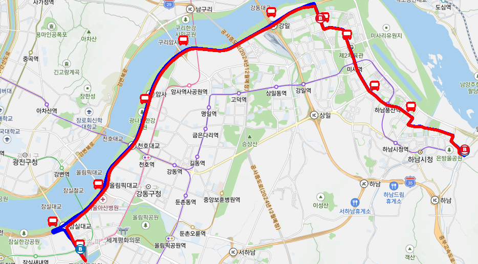 주요 도로 경유: 하남에서 서울로 가는 과정에서 천호대교, 올림픽대교 등 주요 교량을 경유하여 빠르게 서울로 이동할 수 있습니다. 특히, 암사 IC와 강일 JC를 경유하여 고속도로를 통해 효율적인 이동이 가능합니다.