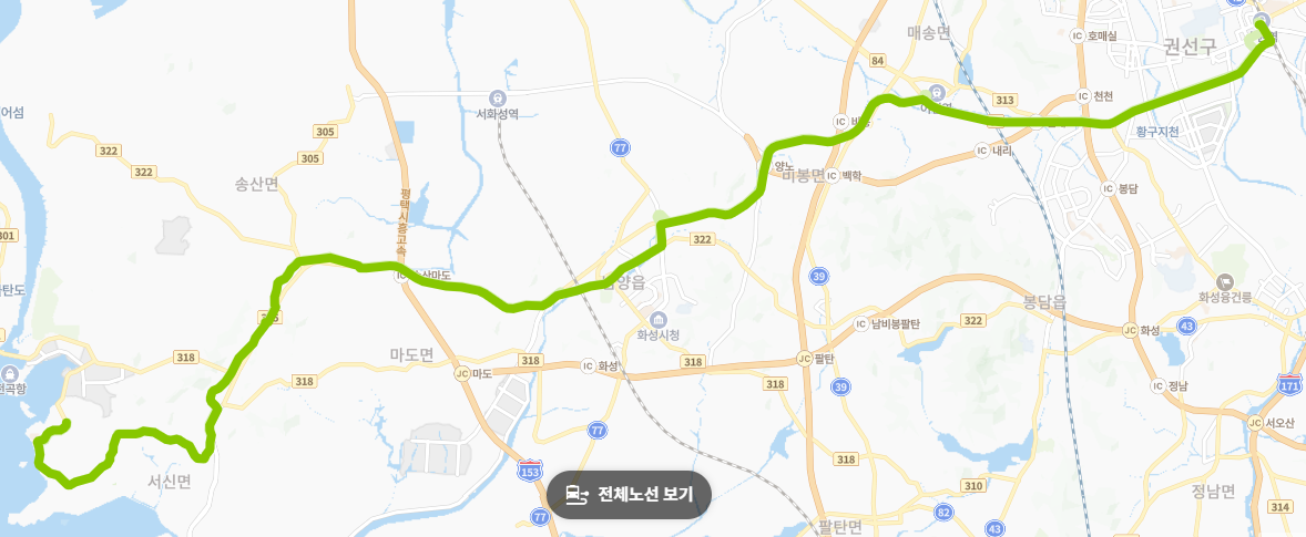 ● 화성 서부 지역의 주요 거점 연결: 제부도, 서신터미널, 사강시장, 남양읍 행정복지센터 등 화성 서부 지역의 주요 관광지, 상업지구, 행정시설 등을 경유하여 해당 지역 주민들의 생활 편의를 높여줍니다. 특히 대중교통이 비교적 부족할 수 있는 화성 서부 지역의 이동 수요를 충족시켜 줍니다.