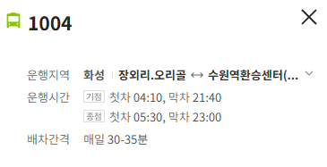 ● 배차 간격: 평일, 주말 모두 약 30~35분으로 비교적 긴 편입니다. (1004-1번은 훨씬 더 김)