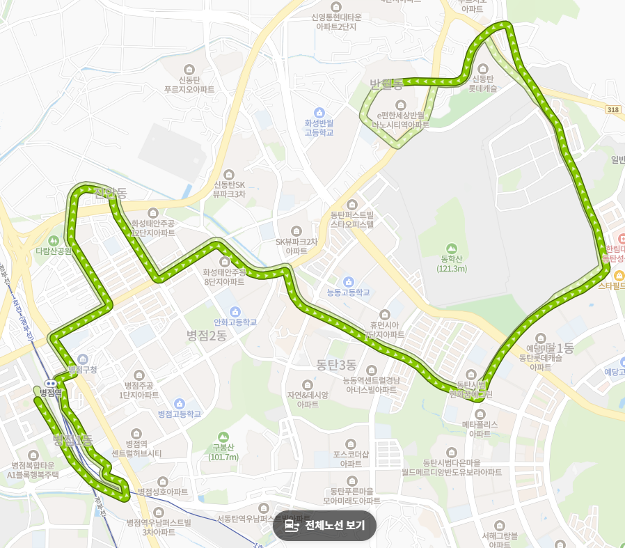 주거 단지 관통: 한일타운, 효성해링턴, 월드메르디앙, 주공 6~11단지, 신동탄 롯데캐슬, 반월 e편한세상 등 병점과 동탄의 주요 아파트 단지를 촘촘하게 연결하여 집 앞에서 바로 이용 가능한 높은 접근성을 자랑합니다.