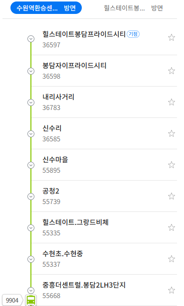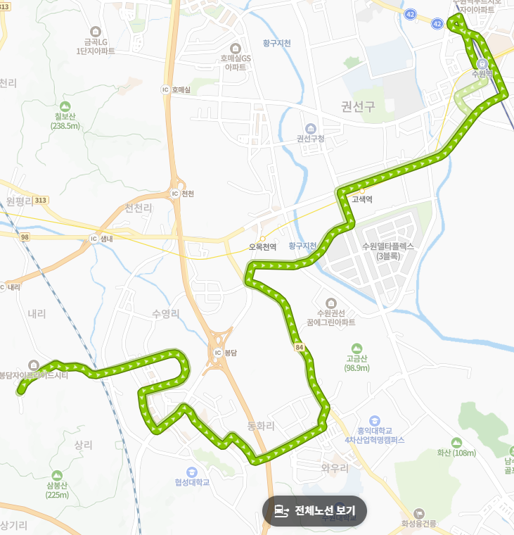 봉담 2지구 핵심 경유: 힐스테이트.그랑드비체, 중흥더센트럴.봉담2LH3단지 등을 모두 경유하여 봉담 2지구 전체를 아우르는 노선 역할을 합니다.