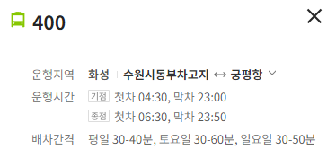 화성 400번 버스 운행노선 수원시동부차고지→동부차고지→상현역→광교마을.린병원.독바위→광교역사공원.광교카페거리→수원광교박물관.광교이마트→광교호반베르디움트라엘.광교해모로→광교한양수자인.호반가든하임→광교e편한세상2차.광교중학교→호반베르디움→광교대광로제비앙→광교파크자이더테라스.열림공원→광교대광로제비앙→호반베르디움→광교중학교.광교e편한세상2차→광교초등학교.광교홍재도서관→광교역.광교대학로→경기대수원캠퍼스후문→경기대수원캠퍼스후문.수원박물관→수원박물관.수원시장애인복지관→경기남부경찰청.봉녕사입구→우만주공4단지→수원시글로벌평생학습관.연무사회복지관.창룡도서관→창룡문.연무대→수원미디어센터→팔달구청.수원화성박물관→팔달문→가족여성회관.이춘택병원.해움미술관.수원농협→향교.팔달보건소.중앙침례교회→세무서.신용회복위원회→수원역.AK플라자→육교사거리(경유)→서둔교차로(경유)→환승센터진입1(경유)→환승센터진입2(경유)→수원역환승센터(6승강장)→벌터교차로(경유)→공구유통타운.중앙자동차매매단지→중보교.수원역자동차운전전문학원→고색동입구→고색파출소.종합공구단지→연안아파트.삼성큰병원→고색역.고색초교.태산아파트→서수원주민편익시설→수원여자대학입구→오목천동태산아파트.서희스타힐스→삼미.쌍용아파트→천천리입구→천천리→일광사→전승아파트→매송초등학교→원평사거리→원평→51사단→어천저수지→어천역→숙곡리천불사→구포3리→구포리과수원→비봉교차로→비봉중고등학교→비봉초등학교후문.삼화3리→천산아파트→삼화리.천산아파트→양노리→양노3리→북양1리.염티고개→북양1리→루나포레아파트→남양읍행정복지센터→남양사거리→남양성지→경기남부수협.보건소→우림아파트→남양6리.남양1리→은장고개→두곡리→재래시장.마도삼거리→마도사거리→외국인보호소→구리섬앞→구리섬휴게소→삼존리자동차성능시험장→돼지고개.삼존리물미→봉가1리→송산농협.사강정형외과→사강시장→사강복지회관→육일리.육교동입구→육일리마을회관→육일리교차로→육일2리.코스코밸리→상안리.한국발효→신흥사→상안1리→상안1.2리→상안2리.SK주유소→상안삼거리→서신→서신초등학교→서신사거리→서신면행정복지센터→사곳입구→영지→백석로입구→백석→백미리입구→용두2리→궁평보건지소→해운교차로→해운경로당→궁평교회→마루교차로→박고지→마루뜰→궁평해수욕장→고잔앞들→궁평항