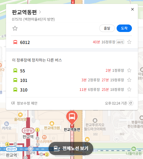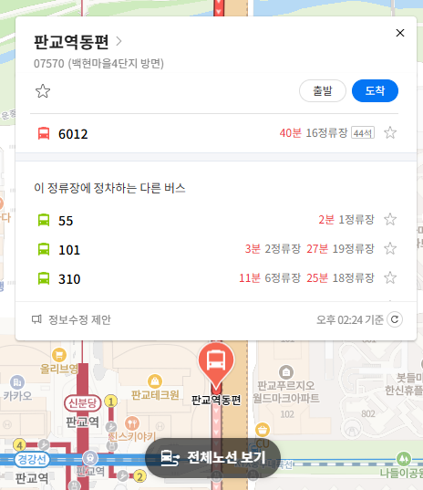 신분당선·경강선 '판교역' 연계로 서울/경기 남부 확장성판교역동편 정류장을 통해 신분당선과 경강선으로 즉시 환승이 가능합니다. 판교가 목적지가 아니더라도 강남이나 광주, 여주 방면으로 이동하려는 동탄 주민들에게 훌륭한 광역 가교 역할을 수행합니다.