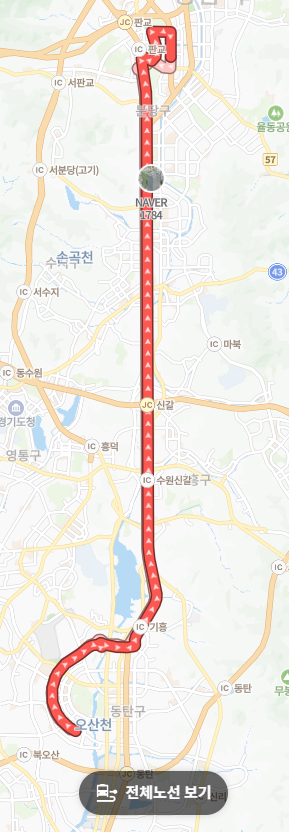 기흥동탄IC를 통해 고속도로에 진입한 후 판교까지 무정차로 달리기 때문에 시내 구간의 정체 스트레스가 적습니다. 광역좌석버스의 편안한 좌석에서 고속도로 구간 동안 휴식을 취할 수 있다는 점도 큰 매력입니다.