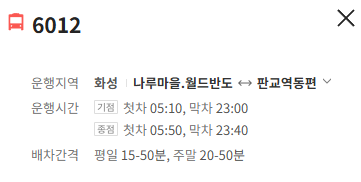 화성 6012번 버스 운행노선 나루마을.월드반도 → 새강마을사거리(미정차) → 솔빛마을.화성동탄중앙도서관 → 다은마을(중) → 메타폴리스(중) → 한빛마을(중) → 예당마을.롯데캐슬(중) → 기흥동탄TG(미정차) → 기흥휴게소(미정차) → 수원신갈IC(미정차) → 신갈JC(미정차) → 죽전(미정차) → 금곡(미정차) → 서울TG(미정차) → 판교진입(미정차) → 화랑공원동편 → 금토천교 → 삼평사거리(미정차) → 판교역동편 → 판교출입(미정차) → 서울TG(미정차) → 금곡(미정차) → 죽전(미정차) → 신갈JC(미정차) → 수원신갈IC(미정차) → 기흥휴게소(미정차) → 기흥동탄TG(미정차) → 예당마을.롯데캐슬(중) → 한빛마을.석우중학교(중) → 메타폴리스(중) → 다은마을(중) → 새강마을.화성동탄중앙도서관 → 나루마을.한화꿈에그린2차