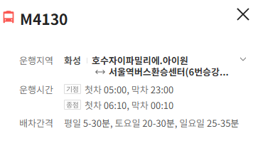 ● 빠른 이동: 광역급행버스(M버스) 특성상 정류장 수가 적고 고속도로를 경유하여 일반 시내버스에 비해 빠르게 목적지에 도달할 수 있습니다.