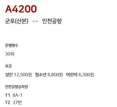 4200번버스 운행 노선 군포.산본(공항버스)→안양.범계(공항버스)→관악역(공항버스)→인천공항3층출국장(T1)→인천공항3층출국장(T2)